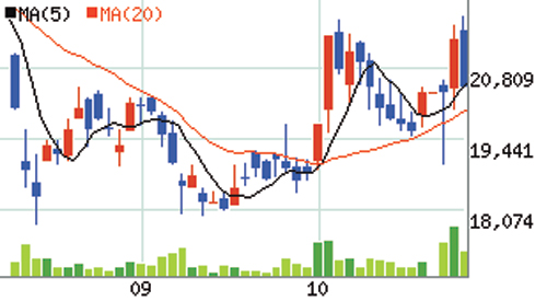 이 회사 주가는 연초 1만4000원대에서 2만4000원까지 꾸준히 상승하다 8월 증시급락기를 거치며 좀처럼 전고점의 주가를 회복하지 못하다 전날 실적발표를 계기로 급등했으나 이날 다시 약세를 보이고 있다.