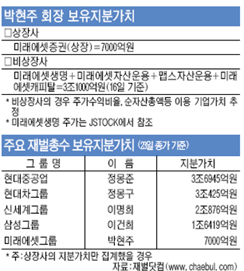 이는 물론 비상장사인 미래에셋생명의 지분을 포함한 수치지만 이들 기업에 대한 박회장의 지분 평가액이 크게 증가함에 따라 재벌 총수들과의 경쟁구조에도 관심이 쏠리고 있다.