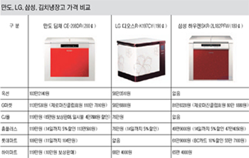 다음으로 싼 곳은 롯데마트로 이 모델을 109만원에 판매하고 있다. 11일까지는 5만원을 할인해 104만원에 판매하고 김치용기도 증정한다. G마켓에서는 이 모델을 113만530원에 살 수 있다. 단 제로마진클럽 회원은 2만2720원 할인된 110만7810원에 구입할 수 있다. 제로마진클럽 회원은 일정 금액으로 회원권을 구입, 카테고리별 상품을 원가에 구입할 수 있는 G마켓 할인회원권이다.