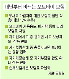 내년부터 사고 경력이 없는 오토바이 운전자는 보험료를 최대 10% 할인해 준다. 또 보험료를 인하해 오토바이 보험가입자를 확대하기 위해 자기신체사고 중 경미한 사고는 보상대상에서 제외하는 상품도 판매된다.