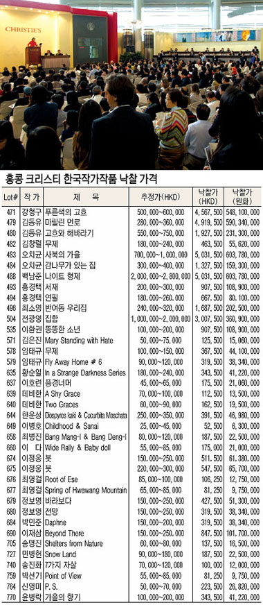 한국미술품은 홍경택(7억7000만원)이 세운 최고가를 갈아치우지는 못했지만 비교적 선전했다. 낙찰총액이 4168만7750홍콩달러(한화 약 50억원)에 달했다. 지난 5월경매보다 1.7배나 늘어난 액수로 사상 최고 낙찰기록이다.