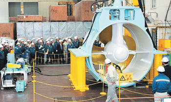 현대중공업은 올해 선박 85척분의 ‘사이드 스러스터’를 수주해 작년의 6척분에 비해 13배 가까이 수주량이 급증했다고 9일 밝혔다. 지난 2005년 독자 개발한 사이드 스러스터는 대형 컨테이너선이나 LNG선의 앞뒤에 장착돼 예인선의 도움 없이 자력으로 선박을 접안하거나 항구 내에서 저속 운항 시 조종성능을 향상시키는 역할을 한다. 회사 직원들이 사이드 스러스터를 시연하고 있다.