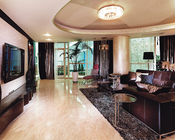 이 같은 외형의 웅장함과 함께 인테리어도 최고급이다. 펜트하우스인 306.80㎡형 유닛에 들어서면 아이랜드 홈바에 수제품인 조명이 눈에 들어온다. 바닥과 벽은 천연대리석으로 꾸며져 있고 천장은 일반아파트(2.65m)보다 높은 3m로 개방감이 한층 돋보인다.