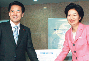 ■사진설명=대통합민주신당 정동영 대선후보와 부인 민혜경씨가 19일 서울 홍은3동 명지전문대에서 투표를 하고 있다. /국회사진기자단