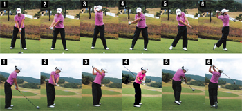 힘차게 치고 나가는 왼쪽 무릎의 리드에 의해 체중 이동이 잘 이뤄지며 다운스윙이 진행되고 있고 손목 코킹의 유지도 훌륭하다. 측면에서 보면 임팩트에 이르기 전 왼쪽 어깨가 제대로 닫혀 있는 것이 뛰어난 방향성을 예고해 준다. 하지만 평평했던 백스윙 톱의 영향으로 클럽 샤프트가 다소 낮고 완만하게 내려오고 있기 때문에 임팩트 순간 강력한 손목의 움직임을 필요로 한다.