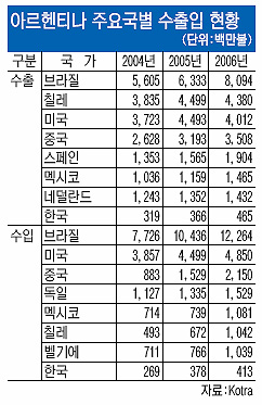 우리나라는 아르헨티나에 공산품을 수출하고 농수산물, 광산물을 수입하는 상호 보완적 경협관계를 유지하고 있다.