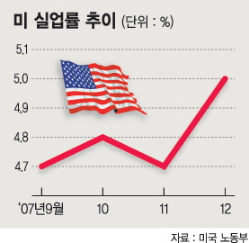 지난 주말 미 노동부는 미국의 지난해 12월 실업률이 전월비 0.3%포인트 오른 5%로 올라선 반면 비농업부문 일자리는 4년 만에 최저수준인 1만8000개 늘어나는데 그쳤다고 밝혔다.