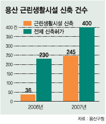 용산구청에 따르면 근린생활시설 허가 건수는 지난 2006년 36건에서 지난해 245건으로 6배 이상 급증했다.