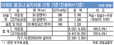 이번에 건교부가 마련한 발코니 확장 비용 산정기준에 따르면 전용면적 85㎡ 전체 확장의 경우 단열창과 골조 및 마감, 가구·인테리어 설치비용, 부가세 등을 합쳐 1291만∼1139만원 정도다. 이는 최근 건설업체들이 책정하는 같은 주택형의 확장비용(1300만∼2000만원)보다 최대 40%가량 낮은 수준이다.