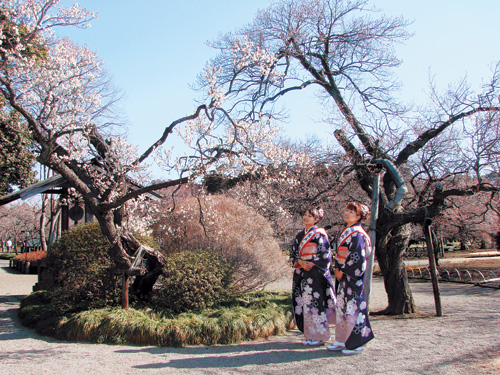 ■사진설명=가이라쿠엔 경내에서 기모노를 입은 여성들이 매화를 바라보고 있다.