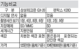 또 삼성케녹스의 GX-20은 디지털 연사 기능이 없는 반면 펜탁스의 K20D는 160만화소로 1초당 21장의 연속촬영이 가능하다. 또 픽쳐 위저드(이미지 커스텀)의 기능은 GX-20이 표준, 선명, 인물, 배경 등 4가지 모드세팅 외에 2가지는 사용자 설정 기능으로 추가했고 K20D는 브라이트, 내추럴, 모노크롬 등 6가지가 모드 세팅이 돼 있다. 촬영사진보기(플레이백) 기능은 K20D가 1장, 2장, 9장 등 3가지로 나눠 선택할 수 있으나 GX-20은 좀더 세분화했다.