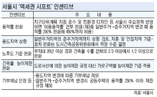 서울시는 하지만 역세권 난개발은 막을 방침이다. 민간에 인센티브를 주는 조건으로 창조적 도시디자인 적용, 어린이집 등 커뮤니티시설 설치 등을 의무화하는 것이다. 또 서울시의 친환경 건축물 인증 75점 이상 획득, 신재생에너지 사용, 에너지 효율 2등급 이상 획득, 공공기여 방안 수립과 역사문화 보전 등 5가지 조건 중 2가지를 의무적으로 적용하도록 했다.