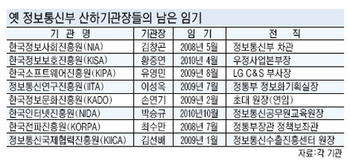 옛 정통부 산하 14개 기관 중 올해 안에 임기가 끝나는 기관장은 2명이다. 행정안전부 소속이 된 한국정보사회진흥원(NIA)의 김창곤 원장은 오는 5월 10일 임기가 끝난다. 김 원장은 노무현 정부시절 정통부 차관을 지냈었다. 후임 원장은 조만간 공모를 거쳐 선임될 것으로 예상된다. 진흥원 한 관계자는 “벌써 후임 위원장 선임을 진행했어야 하지만 정부조직 개편으로 일정이 늦어졌다”며 “조만간 관할부처인 행정안전부에서 원장 선임에 대한 지침이 나올 것”이라고 말했다. 또 방통위 소속의 한국전파진흥원 최수만 원장의 임기는 오는 7월이다. 최 원장은 정통부장관 정책보좌관을 맡았었다.