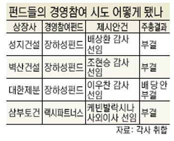 한국기업지배구조 펀드인 일명 ‘장하성 펀드’가 목소리를 높였던 성지건설, 대한제분, 벽산건설과 영국계 주주 행동주의 펀드 랙시파트너스가 경영참여를 시도한 삼부토건의 주총에서도 펀드들의 제안이 모두 표대결에서 무산됐다. 그나마 벽산건설에서만 박빙의 승부가 벌어졌다.