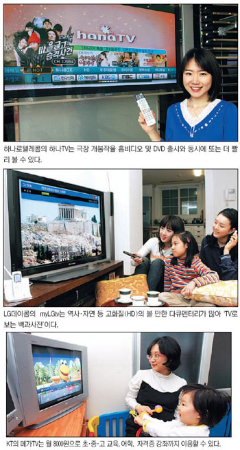 현재 국내에 IPTV를 제공하는 통신업체는 3곳. KT, 하나로텔레콤, LG데이콤이다. 초고속인터넷망을 타고 IPTV를 서비스하는 것은 비슷해 보이지만 업체마다 ‘내용(콘텐츠)’은 조금씩 다르다. IPTV 3사마다 자신만의 강점이 있다는 말이다.