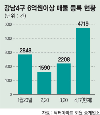 부동산정보업체인 닥터아파트의 회원중개업소 매물 동향에 따르면 1가구1주택 장기보유자 특별공제가 확대 실시된 지난달 21일부터 현재까지 서울 강남, 서초, 송파, 강동 등 강남 4구의 6억원 초과 아파트 매물은 4719건이나 등록돼 있다. 이는 2월 21일부터 3월 20일까지 등록된 2208가구보다 2배 이상 많다. 지난해와 올해 이 지역의 월평균 6억원이상 매물 등록건수는 월 2000건 수준이었다.