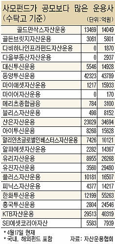 특히 공모펀드보다 사모펀드 비중이 많은 운용사도 22곳에 이른다. 일례로 공모펀드 수탁고가 2804억원인 흥국투신운용의 경우 사모펀드는 2조4546억원 규모다. 블리스자산운용도 공모펀드 규모는 498억원이지만 사모펀드는 8152억원으로 16배가량 많다. 자산운용업계에 따르면 사모펀드 가운데 1인 사모펀드 비중은 전체의 30∼40% 정도인 것으로 추정하고 있다.