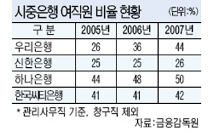 하나은행의 경우, 올해 관리 사무직만으로도 남녀비율이 같아져 지난해 말 현재 전체 7423명 중 여성이 3706명인 것으로 나타났다. 올해 여성 비율이 처음으로 50%를 육박해 지난 2005년(44%), 2006년(48%)에 비해 점점 늘고 있다.