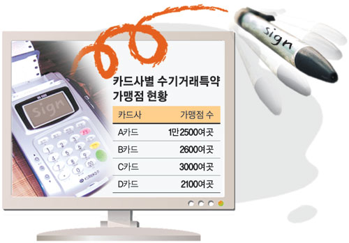 신용카드 회원이 전자상거래나 통신판매 등 비대면(非對面) 거래에서 무서명 결제가 가능하도록 카드사가 가맹점 계약과 별도로 체결하는 ‘수기거래특약’을 둘러싸고 불공정 논란(본지 5월 26일자 10면)이 일고 있다.