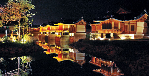 | ▲ 신라궁궐의 의미를 간직한 라궁의 야경. 숙박이 가능한 곳으로 총 16채의 한옥이 연이어 들어서 있다. |
