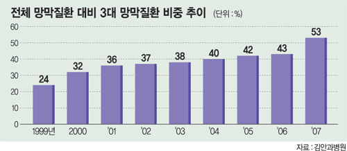 이중 우리나라에서 가장 많은 3대 망막질환으로 꼽히는 ‘당뇨병성 망막증’과 ‘황반변성’ ‘망막정맥 폐쇄증’은 환자수가 급격히 늘어 전체 망막질환에서 차지하는 비중이 1999년 24%에서 2007년에는 64%까지 급증한 것으로 나타났다.