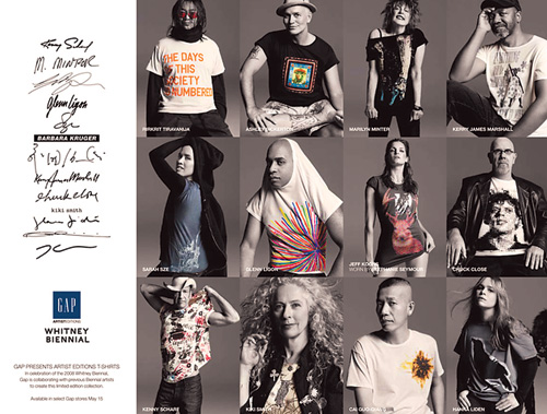 마지막으로 예술가의 이미지를 차용해 기업의 상품에 새로운 가치를 부여하는 예를 살펴보자. 2003년 이후 뒷걸음치고 있는 GAP이 브랜드 이미지를 높이고 젊은 층을 흡수하기 위한 방법으로 미술이란 카드를 꺼내 들었다. 피트니 비엔날레의 공식후원사를 자처하며 척 클로스, 제프 쿤스, 마릴린 민터, 키키 스미스, 카이 구어창, 바바라 크루거 등을 포함한 역대 비엔날레 작가 13인에게 한정판 GAP T-Shirts 제작을 의뢰했다. 한정판 전략에다 피트니 미술관, 시카고 현대미술관, 샌프란시스코 미술관 등 미술관을 활용한 판매 전략까지 동원했다. 그러나 과연 GAP이 이들 13인의 예술가들의 아우라를 등에 업고 새로운 이미지를 생산해 내는데 성공했을까. 여러분이 그것을 보는 동안 새로운 시점과 생각이 떠올랐다면 성공한 것이고, 그렇지 않았다면 실패한 것이다. 뒤샹의 1917년 소변기가 쓰레기가 아닌 미술사의 한 페이지를 장식하기까지 걸린 시간과 논란을 생각해보자. 가치는 결코 쉽게 만들어지지 않는다.