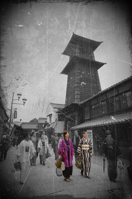 | ▲ 작은 에도라 불리며 에도문화를 느끼게 하는 카와고에의 심볼 도키노 가네. 키모노를 차려입은 여행객들이 전통골목을 거닐며 즐거워하고 있다. |