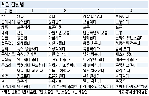 경희대 동서신의학병원 사상체질과 김달래 교수는 19일 “어떤 사람은 고기를 먹지 않아도 고지혈증이 오는 반면 고기를 많이 먹어도 정상적인 혈액분포를 지닌 사람이 있다”며 “각 체질별로 주의할 점을 알고 대처하면 건강을 유지할 수 있다”고 말했다.