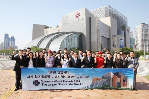 | ▲ 부산 해운대구 우동 신세계 센텀시티 임직원들이 26일 ‘세계최대 백화점’ 기네스 월드 레코드 공식인증서를 받는 것을 자축, 백화점 전경을 배경으로 기념촬영을 하고 있다. |