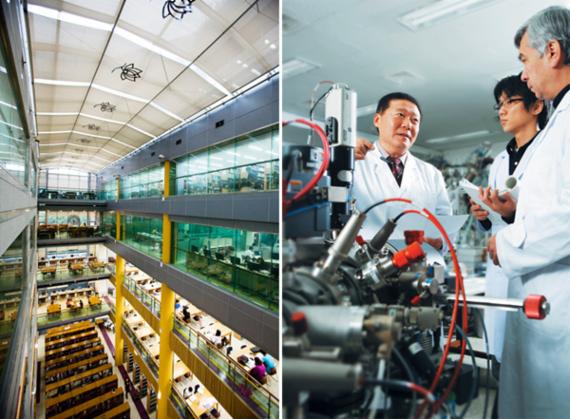 | ▲ 옥상정원 ‘하늘마루’와 최첨단 시설을 갖춘 동국대 중앙도서관(왼쪽사진), 양자기능반도체연구센터 |