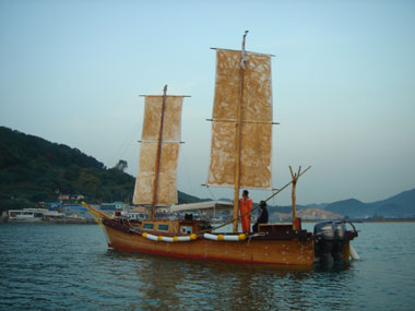 부산 사하구 하단어촌계 포구 작업장에서 지난 3월 건조작업에 들어가 7개월여만에 탄생한 이 배는 우리 선조들의 얼과 지혜가 담긴 전통적인 황포돛단배를 그대로 재현하고 최첨단 엔진과 항법장치까지 갖췄다.
