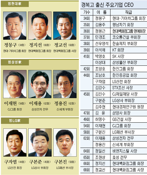 이재용 전무와 정용진 부회장의 사촌지간인 삼성 창업주인 이병철 전 회장의 장손 이재현 CJ그룹 회장도 이들보다 8년가량 먼저 경복고를 졸업했다. 전문경영인으로는 CJ제일제당 김진수 사장과 한솔제지 선우영석 부회장이 경복고 출신이다. 범LG가도 현대와 삼성에 뒤지지 않는다. LS산전 구자엽 회장, LG상사 구본준 부회장, LG패션 구본진 부사장 등이 동문이다.