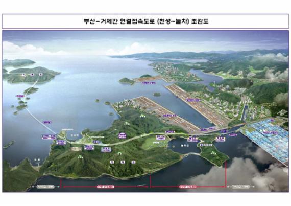 ■사진설명=부산시는 가덕도를 세계적인 체류형 해양복합관광.휴양지로 만들기 위해 국제현상공모에 착수했다. 사진은 거가대교로 통하는 부산∼거제간 연결 접속도로 조감도.