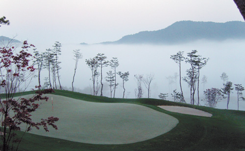 | ▲ 산아래의 주변 산하가 짙은 운무에 휩싸인 것과는 대조적으로 푸르름을 자랑하는 데일코스 9번홀. |