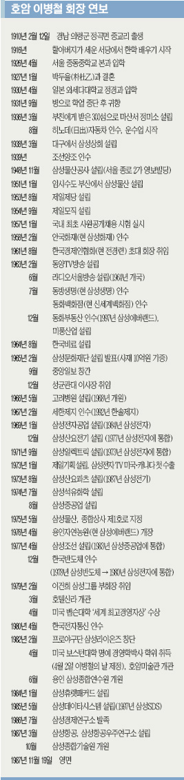 호암은 한국 경제 사상 초유의 수많은 기업을 일으키고 발전시키면서 평생을 바쳤다. 위대한 기업가이자 경영구루인 호암은 1987년 11월 19일 호흡을 보조하는 고무관 장치를 거부하고 78세의 나이로 타계했다.