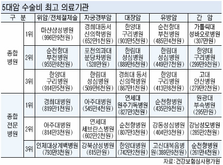 종합병원 중에서 위절제술 진료비가 가장 높은 곳은 마산삼성병원(996만9000원), 가장 낮은 곳은 인제대학교동래백병원(513만원)으로 조사됐다.