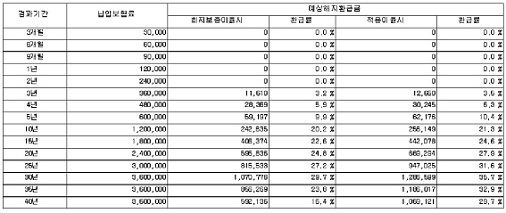 (남자40세, 월보험료 10,000원, 30년납, 상해1급, 자가용, 일부환급형, 최저보증이율 2%, 10.4월 현재 공시이율 4.3% 기준)