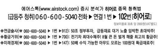 이변이 없는 한, 이 종목 역시! 이번 주를 기점으로 특급재료까지 시장에 노출되면 바로 줄 상한가로 직행할 극비 대박재료주 이기에 올해 제대로 된 급등주를 한번도 잡아보지 못한 투자자라면 지금 당장 단 한 주라도 필사적으로 잡아두길 바란다.