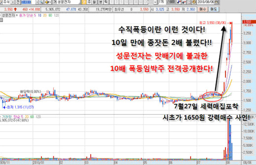 참고로, 7월 6배↑ 폭등수익을 드렸던 ‘큐로홀딩스’에 이어 세력매집을 감지 7월 27일 시초가 1650원 강력매수 사인을 드린 ‘성문전자’가 추천 직후 10일만에 2배↑ 폭등하는 괴력을 보이고 있다! 필자를 믿고 2종목을 선취매 했다면 불과 한달 만에 1천 만원이 ->8천 만원으로 8배↑ 순식간에 불어나는 짜릿한 대박수익의 수 년치 수익을 한번에 거머쥘 수 있었다!