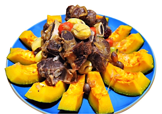 | ▲ 단호박 갈비찜-재료 준비 (1인분) 단호박(600g), 쇠갈비 또는 돼지갈비(200g), 깐밤(80g), 가래떡(150g), 대추, 은행, 양념(간장·물·물엿·흑설탕·대파·마늘·건고추·흑후추·배·양파) |