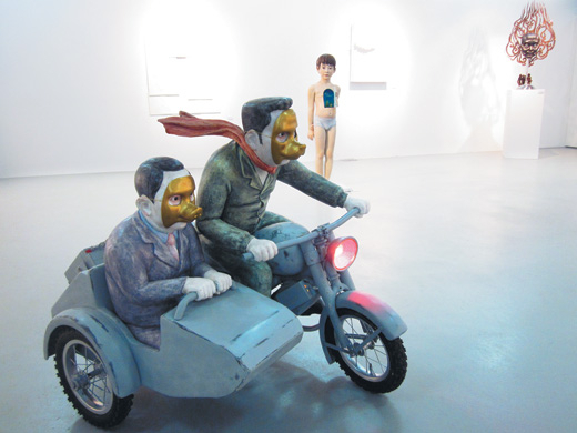 작가들은 곤두선 삶의 비늘로 '자신의 존재감'을 드러냈다. 전시장 한복판에 매달린 등에 가시가 돋은 복어, 초록의 길게 뻗친 손가락에 인간의 신체가 물구나무서서 박혀 있고, 물속에 담긴 흰색의 커다란 얼굴의 잘린 머리 위엔 풍선 8개가 가족처럼 쌓여 있다. 커다란 대관람차 바퀴가 양날개처럼 달린 얼굴 없는 신체, 오토바이에 몸을 싣고 어딘가로 내달리는 사람의 얼굴엔 돼지얼굴 금박 가면이 씌워 있고, 팔과 다리를 쭉 뻗어 입을 크게 벌린 속도감 있는 인간은 떼지어 다니는 멸치 같다.