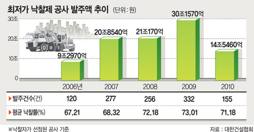 건설협회 관계자는 “2009년 4대강살리기 사업 집중 발주 후 지난해는 사회간접자본(SOC) 시설 예산이 크게 줄면서 상대적으로 최저가공사 발주 물량이 감소했고 업체간 경쟁은 더욱 심해져 낙찰률이 하락했다”고 말했다.