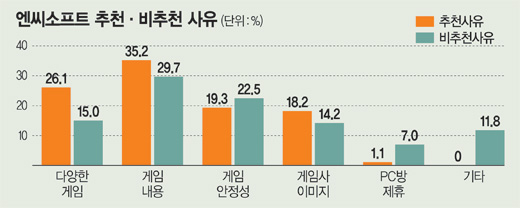 추천한 이유는 '게임내용'이, 비추천하는 이유에도 '게임내용'이 모두 1위로 집계됐다. 이는 그래픽 및 게임성에서 엔씨소프트의 대표 게임들이 높은 수준의 완성도를 보이고 있지만 자동사냥프로그램 사용 등에 대한 소비자 불만도 적지 않기 때문으로 해석된다.