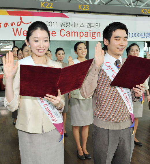 아시아나항공 공항서비스담당 주용석 상무는 “항공 여행을 시작하는 손님들이 항공사를 처음 대하는 곳이 공항이라는 판단으로 그랜드 웰컴 캠페인을 기획하게 됐다”면서 “차별화된 서비스로 올해 외국인 관광객 1000만명 유치에 일조하겠다”고 말했다.
