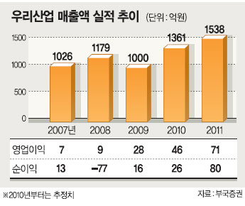 지난 2008년 글로벌 금융위기 속에서 대규모 통화옵션 손실로 적자를 기록했던 우리산업은 2009년 흑자전환에 성공했다. 2010년에는 매출액이 전년 대비 30% 이상 증가하고, 영업이익은 28억원에서 46억원 정도로 무려 60% 이상 급증할 것으로 예상하고 있다. 당기순이익은 2009년 16억원에서 26억원으로 늘어날 것으로 기대하고 있다. 특히 올해엔 풍부한 수주물량을 바탕으로 매출액이 1500억원을 넘어설 것으로 전망했다.