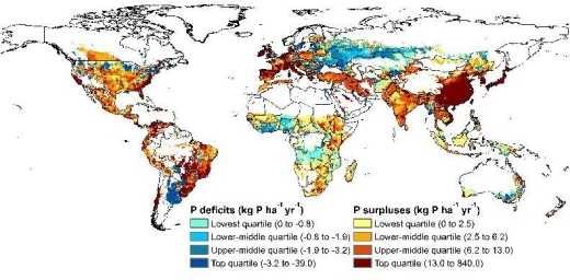 | ▲ 전세계 인(인산비료 중심) 불균형을 나타내는 지도. 붉은 색이 과도사용, 푸른색이 결핍지역이다. 자료: 미국국립과학원회보(PNAS) |