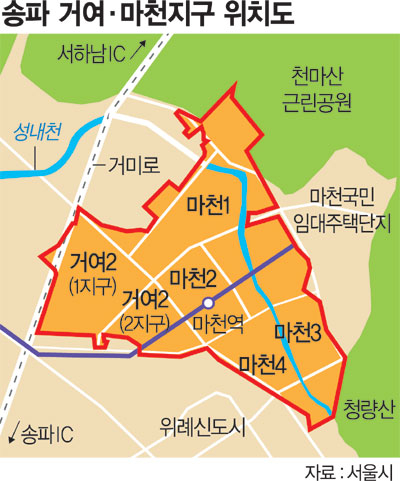 서울시는 거여·마천뉴타운 중 존치정비구역인 마천1·3구역 30만5628㎡를 재정비촉진구역으로 지정, 5052가구를, 9만8690㎡의 거여 2-1구역에는 용적률 상향 등을 통해 1930가구를 각각 건설토록 했다고 23일 밝혔다.