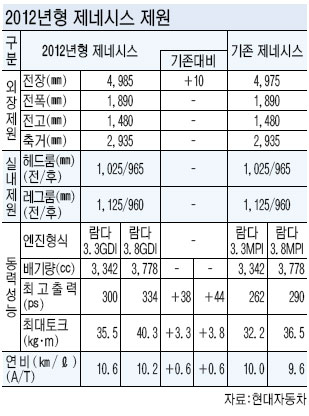 한편 2012년형 제네시스의 판매가격은 △BH330 그랜드 4310만원 △BH330 그랜드 프라임 4620만원 △BH330 럭셔리 4940만원 △BH330 럭셔리 VIP 5390만원 △BH380 럭셔리 4970만원 △BH380 로얄 5660만원 △BH380 로얄 VIP 6290만원이다.