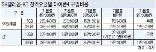 스마트폰 정액요금에 따라 아이폰4구입가격이 달라지는데 월 기본료 3만5000원이나 4만5000원짜리 요금제에서는 두 회사 간 아이폰4 구입가격에 큰 차이가 없다. 그러나 무제한 무선인터넷을 쓸 수 있는 5만5000원짜리 정액제 구간에서는 SK텔레콤의 구입가격이 기종마다 2만원가량씩 비싸게 매겨져 있다.