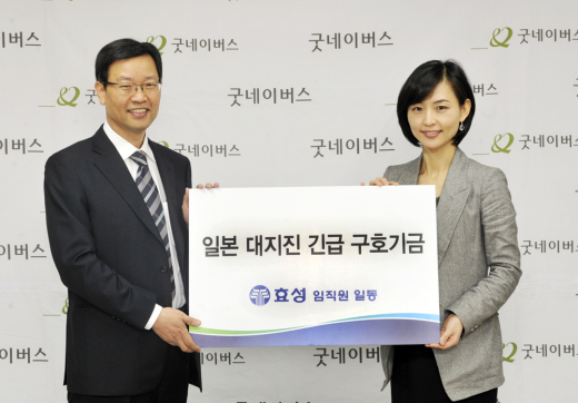| ▲ 22일 효성 이상철 상무(왼쪽)가 임직원들이 직접 모은 일본 구호성금 7000만원을 양진옥 굿네이비스 나눔사업본부장에게 전달하고 있다. |